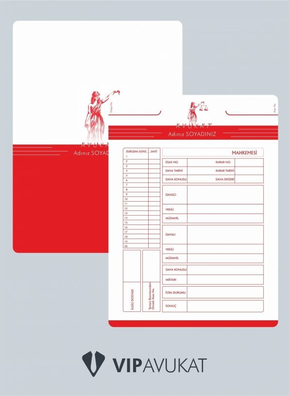 Avukat Dosyası ürünlerimizden 140 numaralı modelimizi incelemektesiniz. Bu modelde renk skalamızdaki kırmızı renk kullanılmış olup, renk skalamızdan dilediğinizle değiştirebileceğiniz gibi size ya da logonuza özel renklerde de baskı talep edebilirsiniz. Tasarımın içeriği konusunda da tamamen size özel hazırlayabilmekteyiz. Bu model standart büro icra dosya formatında hazırlanmış olup, içeriğini taleplerinize göre değiştirebilmekteyiz. Sol bölümdeki duruşma günleri tablosu son derece kullanışlı ve şık bir görüntü sunmaktadır. Siz de büronuza özel dosyanızın tasarımı için hemen bize ulaşıp taleplerinizi iletebilirsiniz.